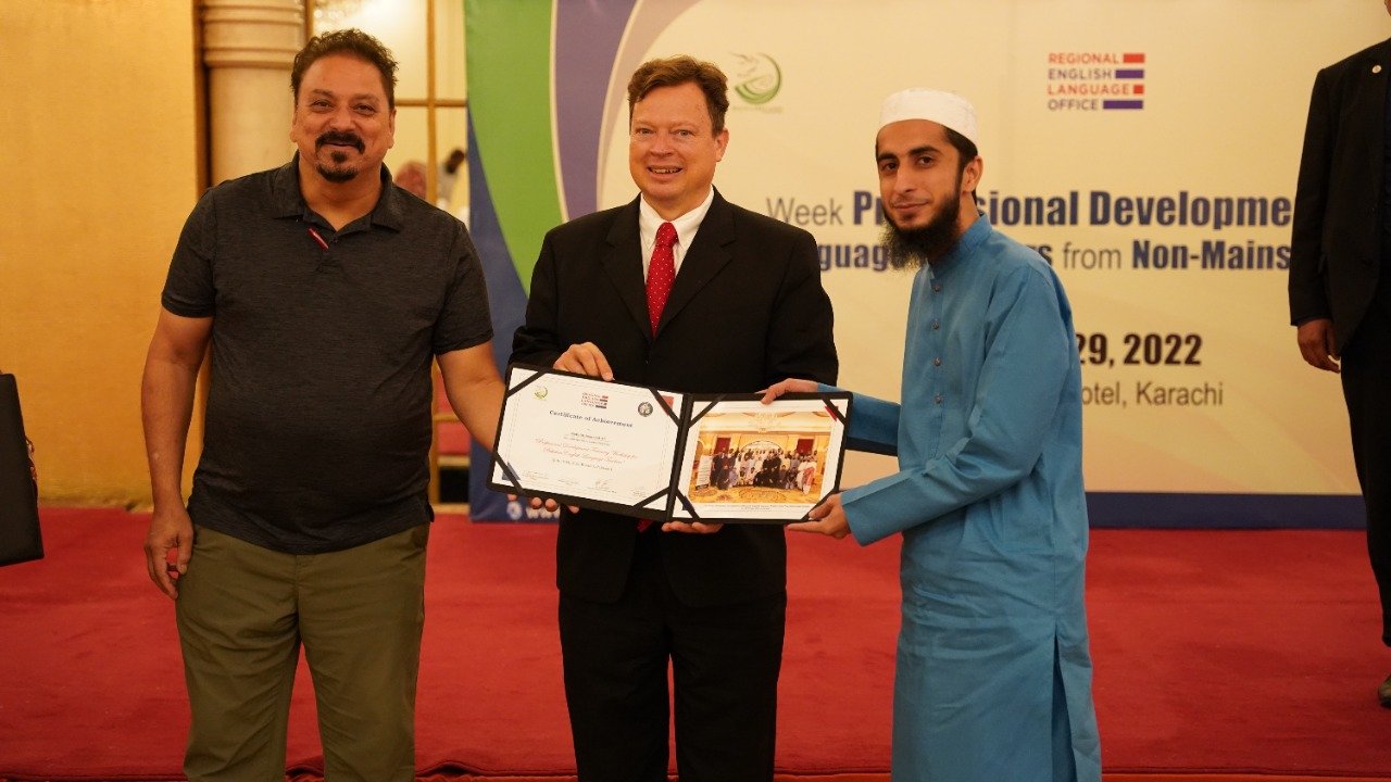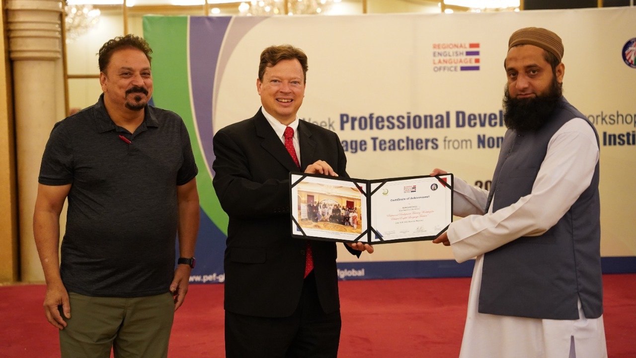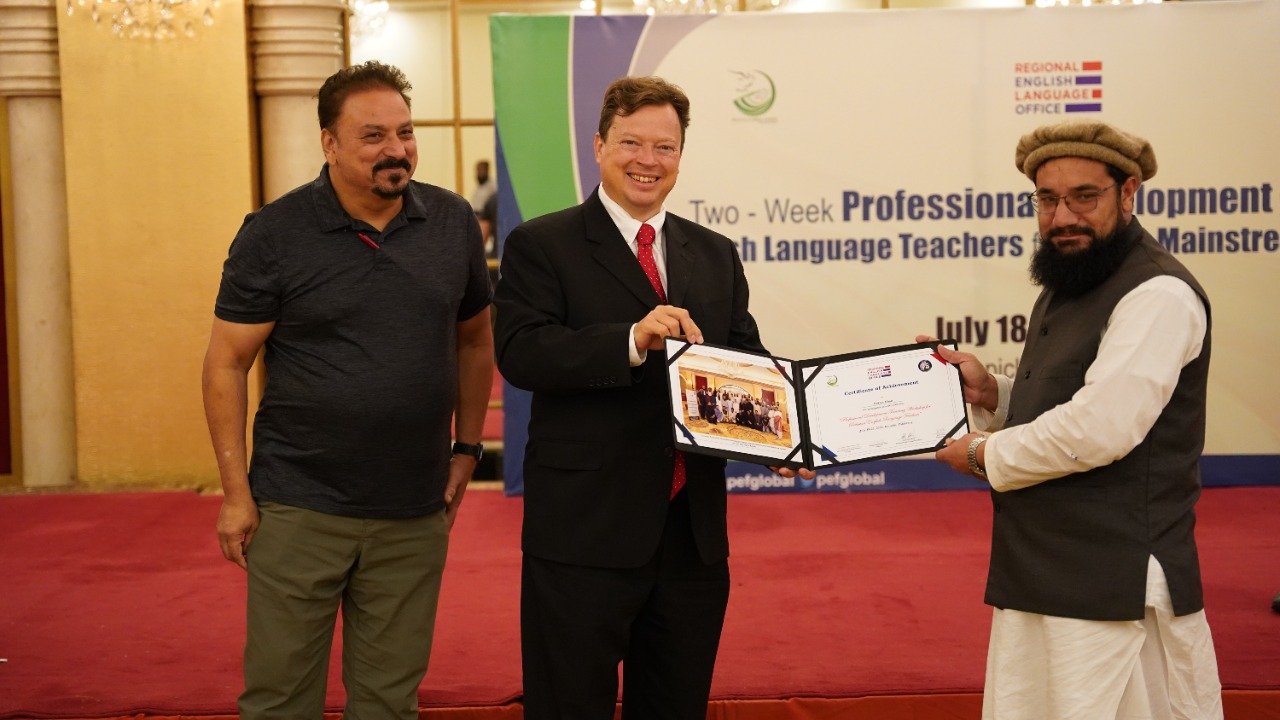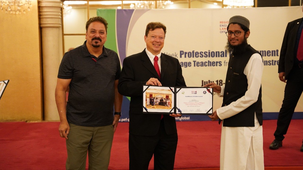 Public Affairs Officer (PAO) for the U.S. Consulate in Karachi, Mr. Lee McManis, participated in the closing ceremony and distributed the certificates among the participants. At the end of the workshop the honourable Mr. Lee, congratulated the trained teachers on successfully completing a two-week training program. He said “As we close this training program, it opens the door for you to experiment, apply and innovate the learned knowledge in your local context. For us, the success of any training program lies in the success stories we receive from the participants. I would like to take this opportunity to encourage you to go back to your institutions, apply the learned knowledge, tools and resources in your classrooms, and most importantly, share them with others in your community. Our star teachers are those who run informal workshops, webinars and training programs to cascade the information further to benefit the maximum English language teaching community of Pakistan. I am looking forward to hearing some great success stories from you all.