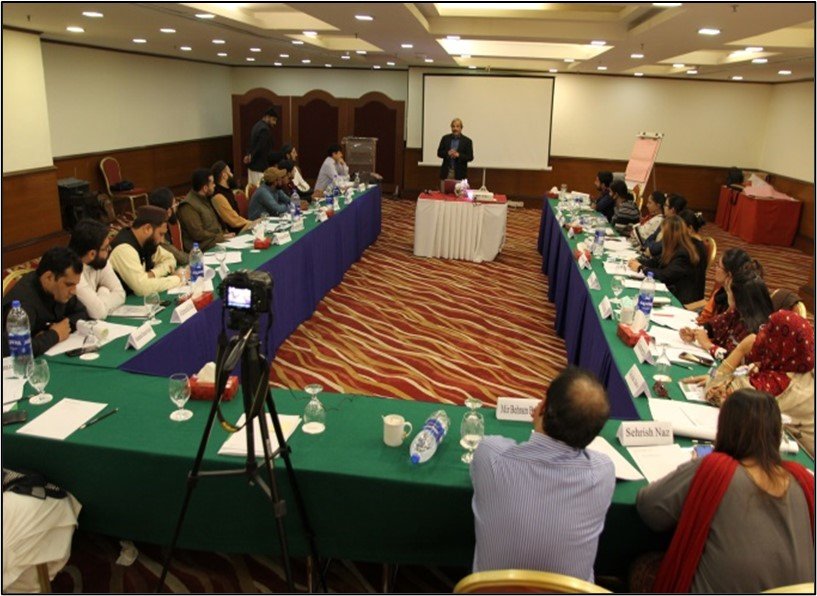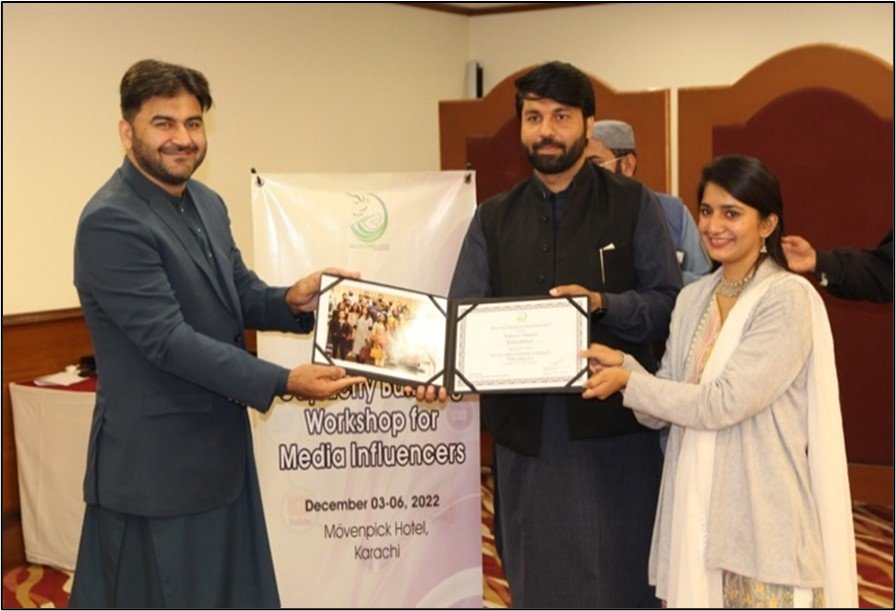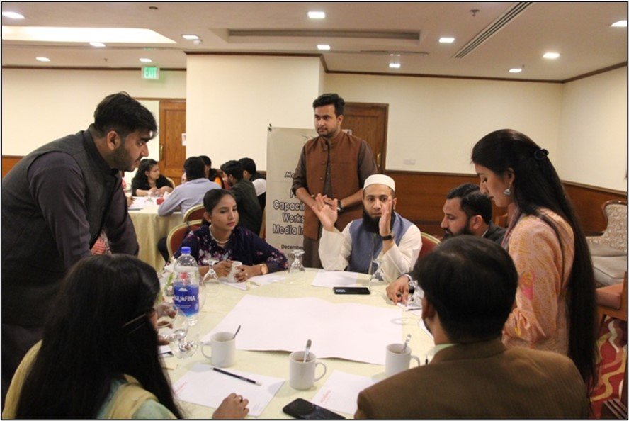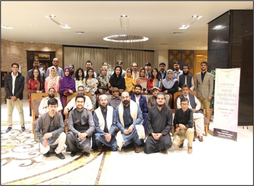 Peace and Education Foundation conducted two (02) Four-day capacity building training workshops for Media Influencers in Karachi from December 03-06, 2022 and December 08-11, 2022 respectively. A total of 55 Participants (29 male and 26 female) from various Muslim denominations, institutions and different media outlets (Print, electronic and social media) representing Sindh and Balochistan were engaged through two-bathes of the training. The workshops covered a broad set of physical and intellectual exercises, all aimed to better their understanding, comprehension and skill-set that ultimately contribute into their role for building peace in the society. The training strategically designed in a manner to ensure optimal interactions and mutual discussions with the group of participants that includes group works, role plays, revealing their personal stories on conflicts or violent conflicts and questions & answer sessions with CVE and media experts. The training curriculum included critical thinking, Diversity and ethics of disagreements, The power of one- self-awareness, Role of media in narrative building, types of information disorder, disinformation campaigns, How to stop fake news, tools to fight disinformation, different laws related to media.