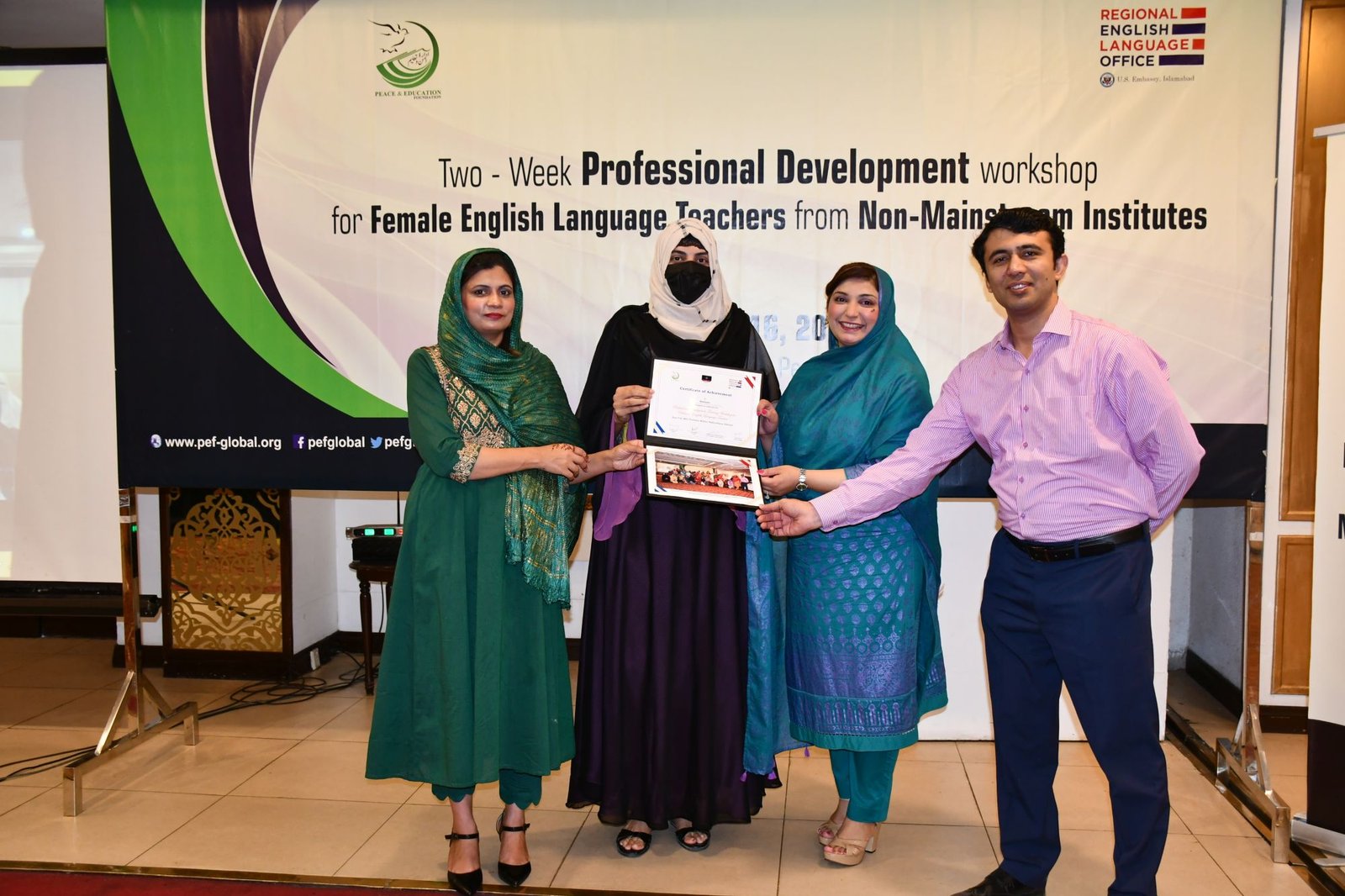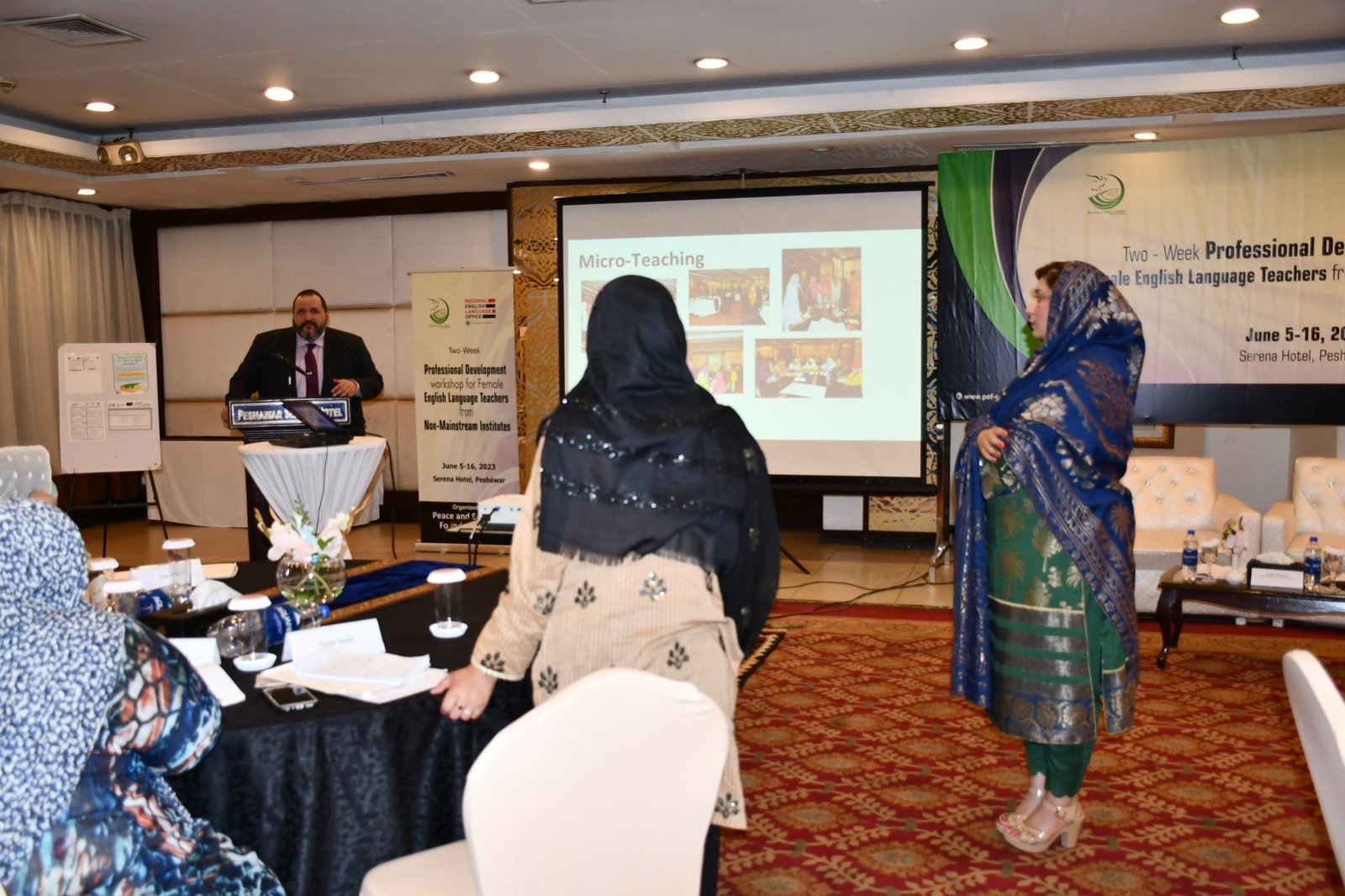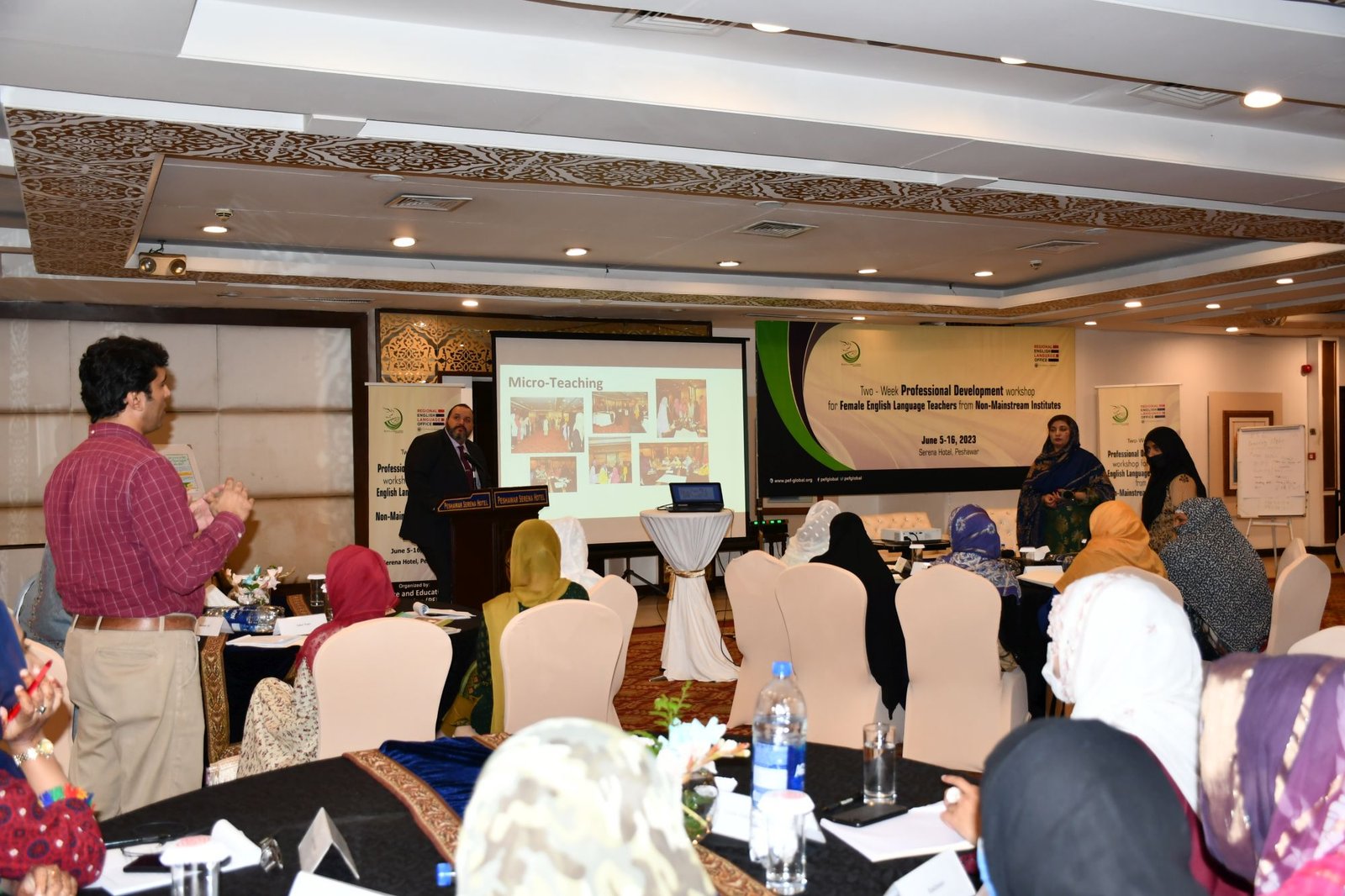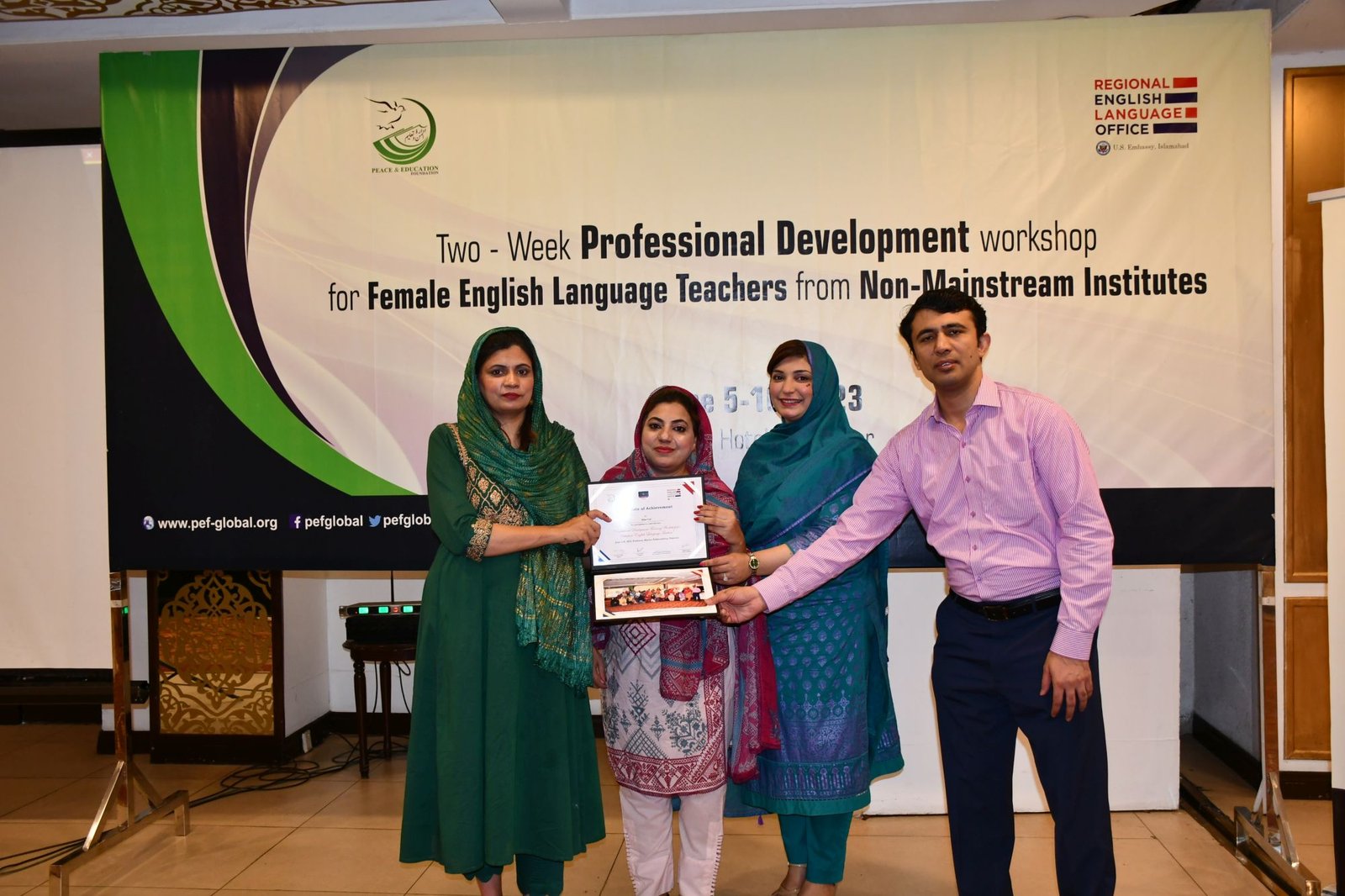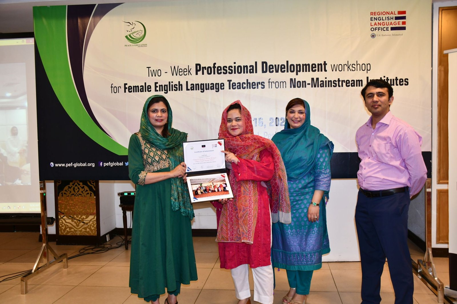 U.S. English Language Specialist Dr. Salma Waly teamed up with Pakistani English Language Expert Ms. Ismat Bahar to design and conduct the workshop. The workshop was participatory in nature and covered a wide range of topics including effective communication techniques, classroom management, integrated lessons with a variety of materials on the most important topics and content about teaching methodology, interactive activities covering listening, speaking, reading, writing and grammar were conducted. The participants did micro-teaching: they prepared and delivered 15-minute mini-lessons. The trainers and PEF project Manager met one-on-one with the participants to work on lesson plan work/feedback.