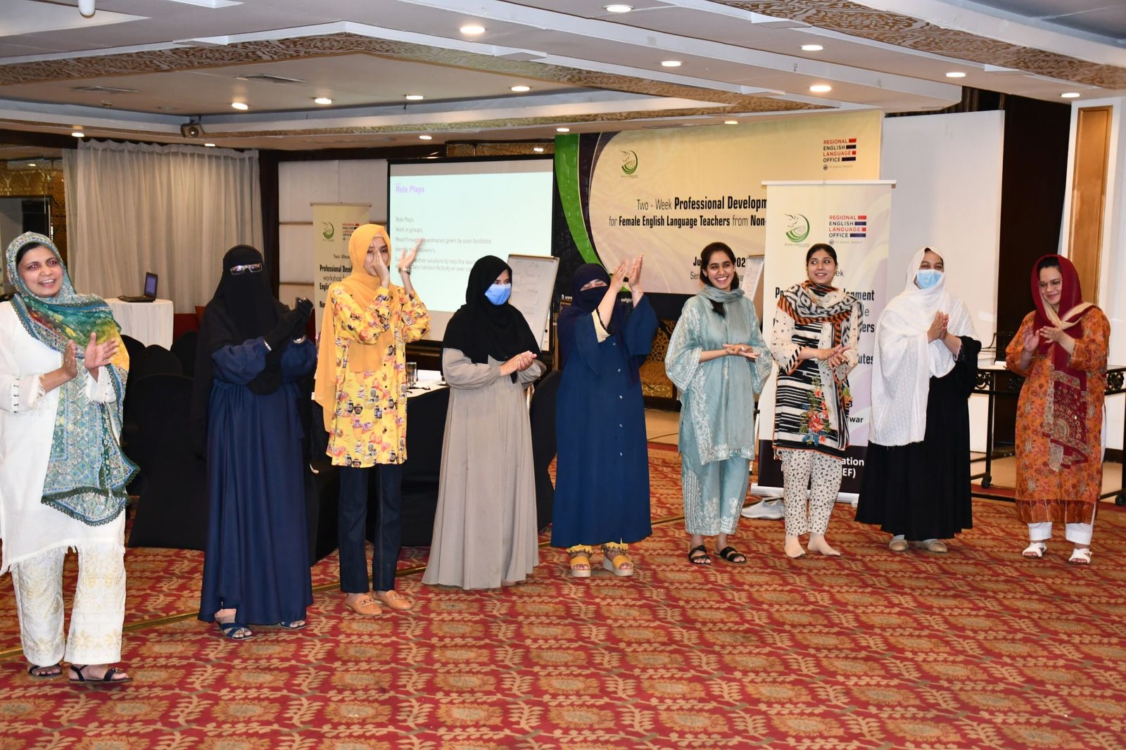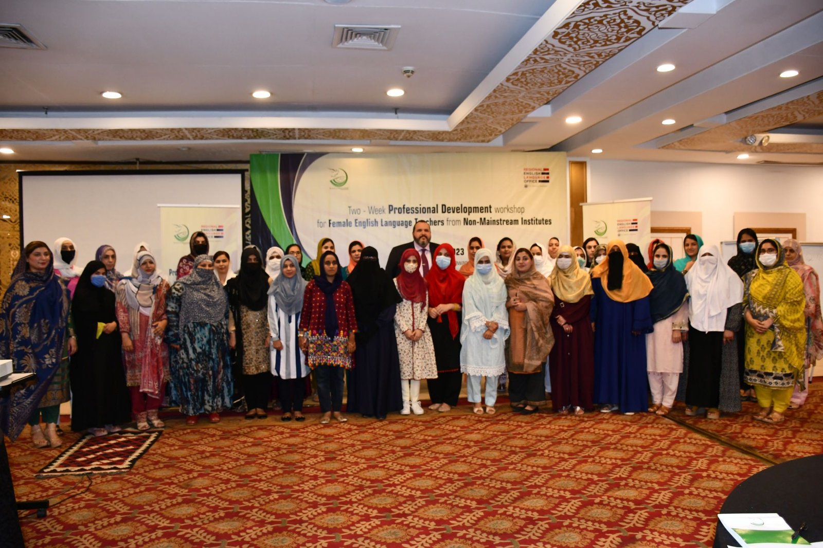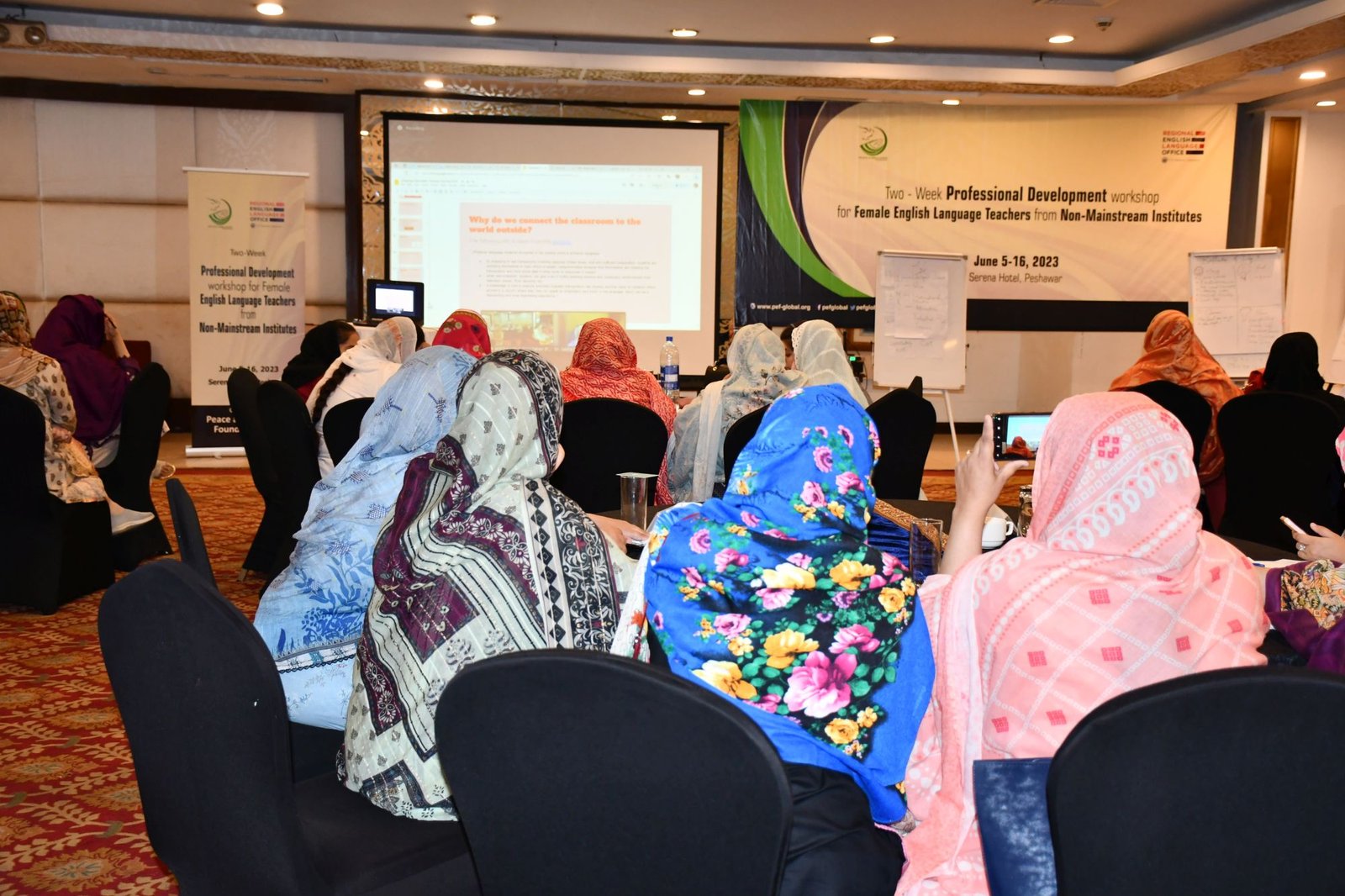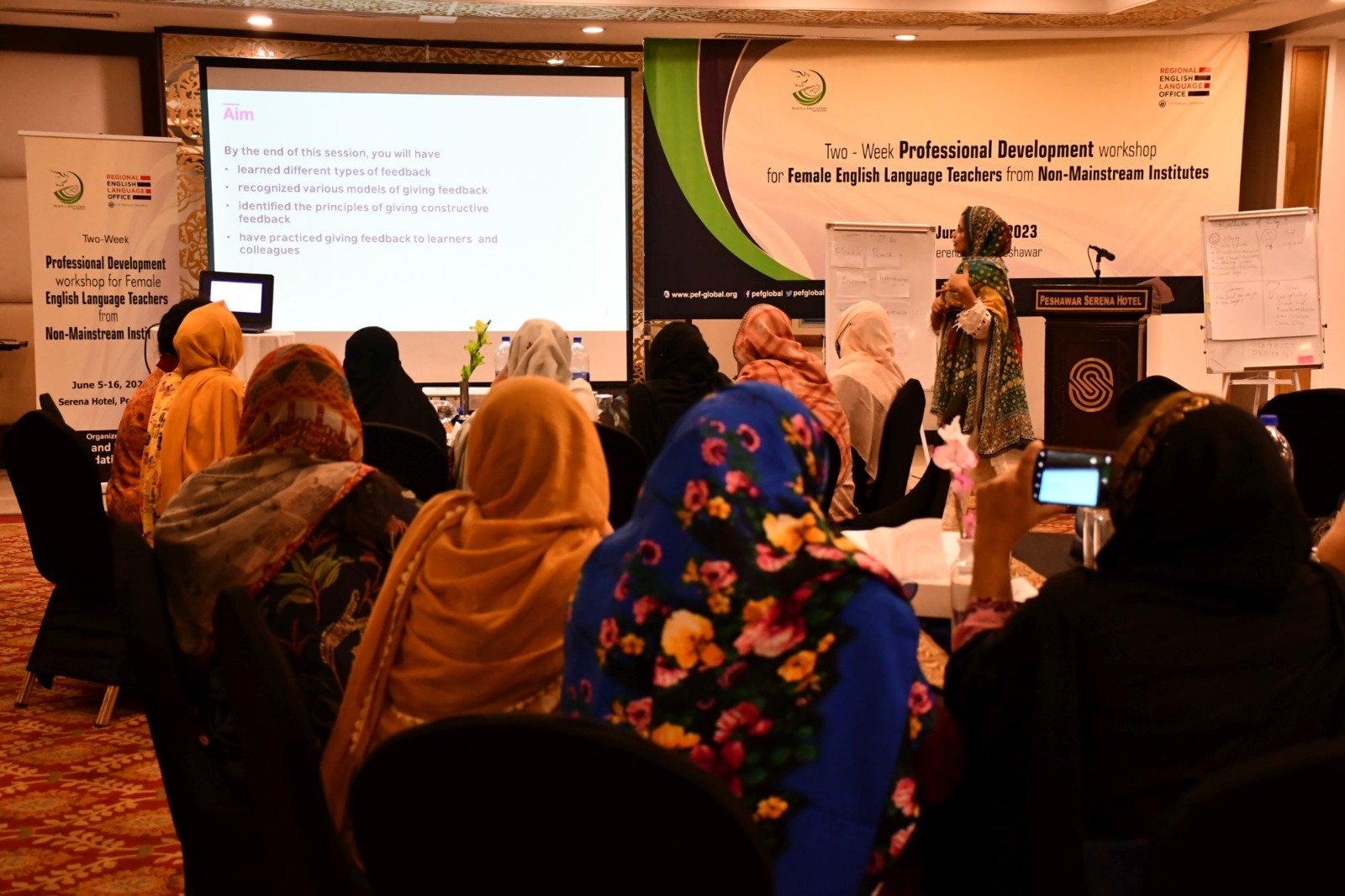 U.S. English Language Specialist Dr. Salma Waly teamed up with Pakistani English Language Expert Ms. Ismat Bahar to design and conduct the workshop. The workshop was participatory in nature and covered a wide range of topics including effective communication techniques, classroom management, integrated lessons with a variety of materials on the most important topics and content about teaching methodology, interactive activities covering listening, speaking, reading, writing and grammar were conducted. The participants did micro-teaching: they prepared and delivered 15-minute mini-lessons. The trainers and PEF project Manager met one-on-one with the participants to work on lesson plan work/feedback.