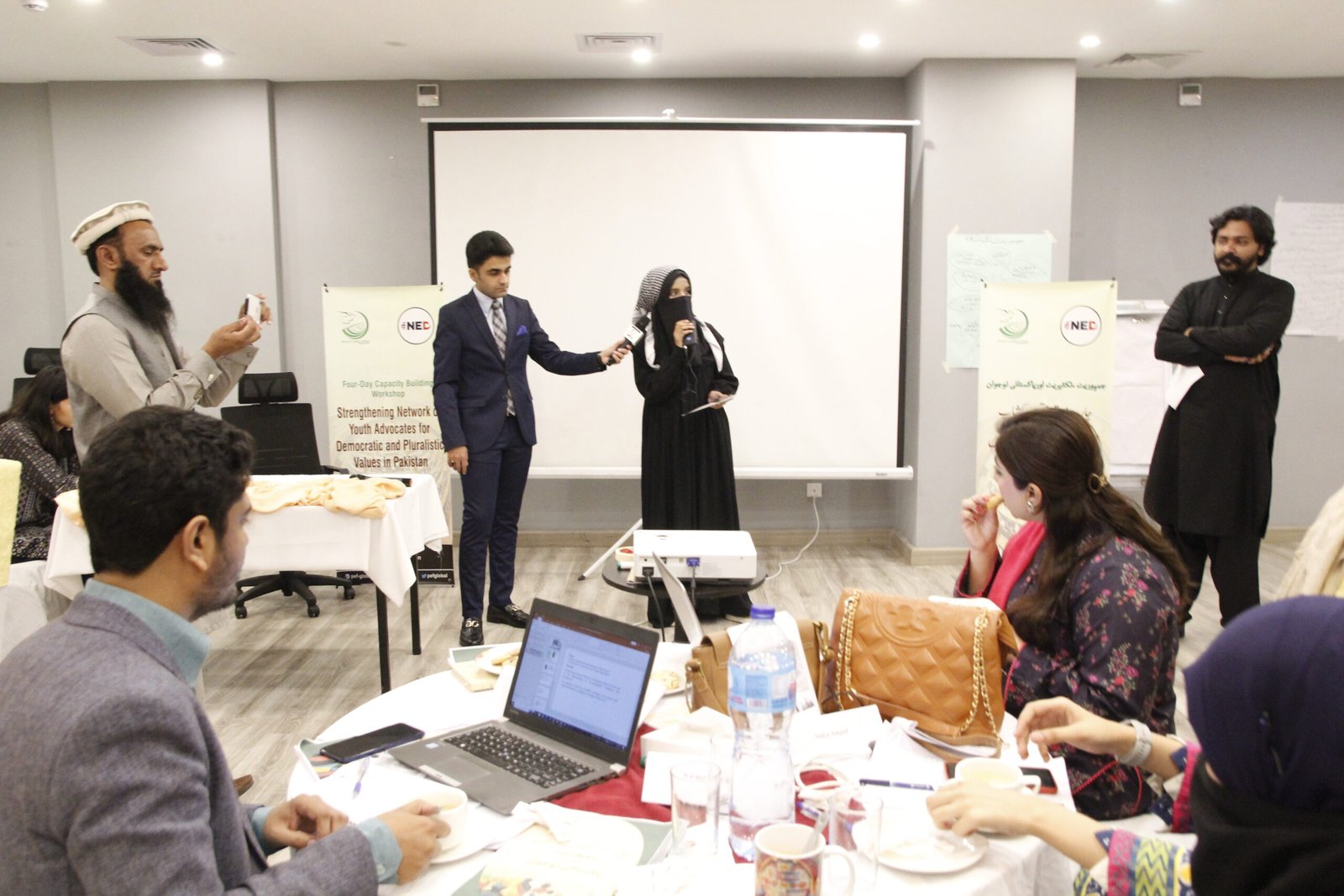 Notable figures, including Worthy Dr. Taimur Rehman, Associate Professor of Political Science at LUMS, Zanaya Chaudhary (Transgender & Women rights activist, and human rights defender, working as the victim support officer with Punjab Police) and Pir Syed Habib Irfani (Member of Council of Islamic Ideology), Mehmood Ghaznavi Head National Peace Committee and Moulana Asim Makhdoom, Chairman all sects Ulema Board and Nayyab Ali (Human Rights Activist) graced the closing ceremony with their insights on the workshop’s significance and the crucial role of youth in advancing democracy in Pakistan.